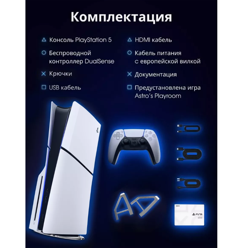 Товар новый, запечатанный, опломбированный, оригинальный. Евровилка уже в комплекте, докупать не придется! Заявленная производителем память 1 TB может отдичаться от фактической. Консоль PlayStation 5 Slim выпущена компанией Sony в ноябре 2023 года, версия 2000A (с дисководом), Япония (1 -я последняя ревизия ноябрь 2023 г). Дизайн PS5 Slim не сильно отличается от предшественницы. Заметное новшество — уменьшенный «воротник» консоли, который теперь не так сильно выпирает из корпуса устройства. Есть и некоторые другие изменения: Sony заменила один порт USB Type-A на USB Type-C на передней панели, вентиляционные отверстия сверху лишились решетки, а также появилось разделение матовых и глянцевых панелей. Геймпад не получил никаких изменений — это все тот же DualSence, который использовался в первой ревизии PlayStation 5. Поддержка адаптивных триггеров, управление движением и совершенно точный механизм передачи вибрации, — ключевые преимущества DualSence. Благодаря тонкому дизайну PS5 игроки получают мощные игровые технологии, заключенные в элегантную и компактную консоль. Ваши любимые игры всегда готовы и ждут, пока вы начнете играть, благодаря встроенному твердотельному накопителю емкостью 1 ТБ. Максимизируйте свои игровые сессии благодаря практически мгновенной загрузке установленных игр для PS5. Испытайте полное погружение в невероятно реалистичные миры благодаря специальным алгоритмам вычисления световых лучей, с которыми избранные игры PS5 заиграют красками света, тени и отражений. Наслаждайтесь плавным изображением на мониторах 4K во время игры с частотой кадров до 120 fps для игр с поддержкой частоты обновления 120 Гц. При подключении к телевизорам с HDR картинка игр PS5 с поддержкой этой технологии станет невероятно реалистичной с живыми, яркими цветами. Консоль PS5 поддерживает вывод сигнала 8K, чтобы в игры можно было играть на экранах с разрешением 4320p.