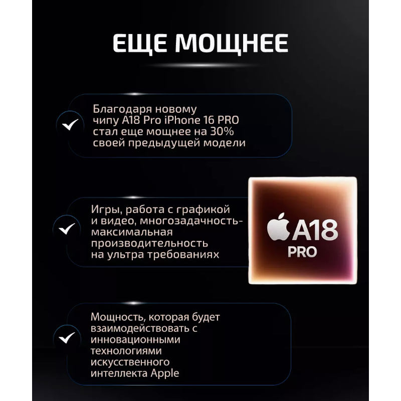 Погрузитесь в будущее с iPhone 16 Pro, где инновации встречаются с элегантностью. Оснащенный потрясающим 6.9-дюймовым Super Retina XDR OLED дисплеем с разрешением 2622×1206 пикселей, этот телефон предлагает невероятно реалистичное изображение с яркостью, достойной профессиональной кинематографии. С технологией ProMotion вы получаете плавное и реактивное взаимодействие с контентом, которое раньше казалось невозможным. А внутри айфон про макс работает мощный процессор, который переводит границы производительности. С ним вы можете запускать самые ресурсоемкие приложения, игры и мультимедийные проекты без малейших задержек. Кроме того, улучшенная система охлаждения гарантирует оптимальную работу даже при интенсивном использовании. А теперь давайте перейдем к камерам. iPhone 16 Pro оснащен самой передовой системой камер, позволяющей вам зафиксировать мгновение с необыкновенной детализацией и яркостью. Смело снимайте в любое время суток благодаря технологии Deep Fusion, которая обеспечивает великолепные результаты даже при слабом освещении. Кроме того, смартфон предлагает улучшенную автономность работы благодаря новым технологиям оптимизации энергопотребления. Теперь вы можете наслаждаться вашим устройством дольше, не беспокоясь о зарядке. Мы заботимся о безопасности, поэтому упаковываем каждый Ваш айфон в специальную коробку, благодаря которой телефон не бьется и не тресятся во время транспортировке. И все это упаковано в исключительно тонкий и стильный корпус, в чёрном(Black Titanium) исполнении который дополняет ваш образ, делая его еще более выразительным. Откройте для себя мир новых возможностей с iPhone 16 Pro уже сегодня.