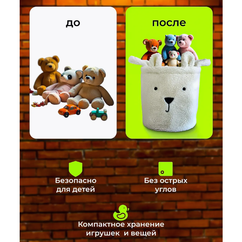 Эта мягкая, плюшевая корзина идеально подходит для хранения игрушек. Удобный органайзер, который поможет навести порядок в детской комнате. Он станет отличным местом для хранения различных вещей. Также может использоваться как контейнер в ванной или спальне. Изделие выполнено из кашемирового хлопка типа букле, она плюшевая, как барашек или овечка. Держит форму, благодаря металлическому каркасу. Мягкая ткань приятно дополняет интерьер дома. Короб имеет складной дизайн, что позволяет легко его хранить и перемещать. Взрослым и детям будет удобно пользоваться этим ведерком для игрушек и других предметов. Этот продукт поддерживает чистоту. Вмещает различные аксессуары, помогая организовать пространство. Идеально подходит для белья и полотенец, одежды. Коробка отлично подойдёт как подарочный презент для мальчиков и девочек любого возраста. Корзиночка легко стирается ,внутри есть подклад. Хранить одежду и игрушки в одном месте теперь просто! Приятный цвет гармонирует с любым интерьером, а ручки помогают легко переносить корзинку. Благодаря структурированному каркасу, большая корзина не теряет форму даже при больших нагрузках. Применять её можно в прихожей или гардеробной для грязного белья. Эта вместительная система хранения поможет поддерживать порядок в доме и избежать захламленности комнат. Складная корзина бельевая подходит для любых домашних дел. Хозяйственный бак 60 литров можно приспособить под разные нужды, держа в порядке все для дома и стирки: для детского, чистого и грязного белья, под носки, нижнего или постельного белья. Выбор такой корзины — это шаг к созданию уюта и порядка в любой комнате, а также отличный способ приучить малыша убирать за собой игрушки!