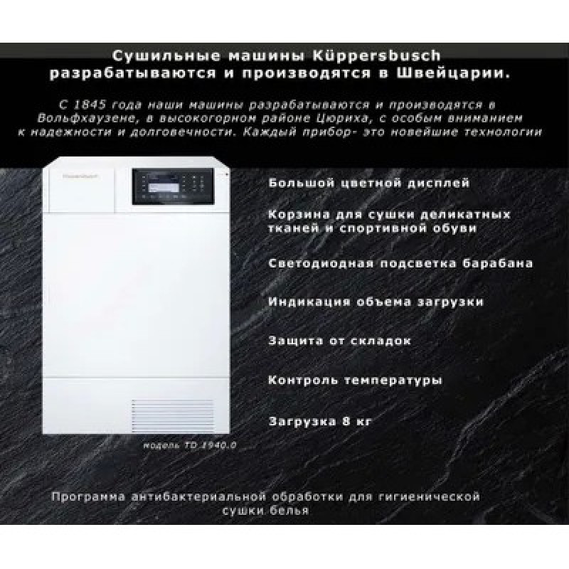 Сушильная машина Kuppersbusch T 40.0 G Solid GoldПрограммы/дополнительные программы: Автоматические программы для хлопка и немнущихся тканейОт степени сушки «под утюг» до «экстра-сухое»Специальные программы Сушка в корзине, Удаление пыльцы, Смешанное, и другие программы: Рубашки, Джинсы, Синтетика, Шерсть, Спортивная одежда, Пух/ подушки, Махровые полотенца, Пропитка, Шелк, Освежить (10-90 минут), Отсрочка старта (10-150 минут)Избранное Сохраняет до 6 Ваших любимых программДополнительные функции Антибактериальная обработка, Бережный уход +, Сушка +, Отсрочка старта, Экспресс8 кг белья будут полностью высушены за 96 минут («в шкаф»)Преимущества:Большой цветной дисплей 4,3’’Корзина для сушки деликатных тканей и спортивной обувиСушильная машина конденсационного типа с технологией Heat Pump и система самоочистки Autoclean для эффективного использования электроэнергии на протяжении всего срока службы машиныВысший уровень эффективности конденсацииПрограмма антибактериальной обработки для гигиенической сушки бельяПрограмма «Удаление пыльцы» позволяет очистить ткани от пыльцыПревосходная шумоизоляция, макс. 61 дБ(А)Светодиодная подсветка барабанаЗащита от складокЭлектронная система измерения остаточной влажности бельяИндикация хода программы и времени до окончания программы, отложенный запуск – до 7 днейРегулируемый по интенсивности акустический сигнал окончания программыУгол открывания люка – 180°, диаметр люка – 36/31 смВозможность перенавески люка (правая/левая)Защита от детейКонтроль температурыСпециальные программыСушка в корзинеВлажные вещи из шерсти желательно как можно меньше подвергать воздействию, так как они имеют тенденцию сморщиваться и садиться. Спортивная обувь может повредить барабан из-за своего веса. Использование корзины позволяет выполнять деликатную сушку без перемещения отдельных стойких к машинной стирке предметов: шерстяные изделия, спортивную обувь из синтетических материалов или искусственной кожи, шапки, велосипедные шлемы, мягкие игрушки, игрушки и пр.СмешанноеЭта программа оптимально подходит для сушки смешанной партии белья из хлопка и синтетикиДругие программыИспользуйте эти программы для оптимальной сушки различных видов текстиля, например сорочек, блузок, джинсов, шерсти и пр.Дополнительные программыАнтибактериальная обработкаПри выборе этой программы увеличивается время дополнительной сушки, что позволяет уничтожать большинство бактерийБережный уход плюсДля бережной сушки деликатных вещей. Температура сушки пониженаОтсрочка стартаС помощью данной программы запуск программы можно отложить на более позднее время в соответствии со своим привычным образом жизни (например, для использования льготного ночного тарифа на электроэнергию)Сушка +При выборе этой программы временно увеличивается степень сушки — на время работы выбранной программыВремяПри открытии программы с управлением по времени отображается минимальное время выполнения программыЭкспрессДля быстрой сушки небольшой партии или отдельных изделий из хлопка, синтетики или смешанной тканиХарактеристики:Конденсационная сушильная машина с технологией Heat PumpЗагрузка 1-8 кгСтационарная установка/установка в колоннуНавеска люка левая/праваяВозможность изменения навески люкаРазмеры прибора (Ш х В х Г): 595 х 850 х 640 ммСделано в Шве